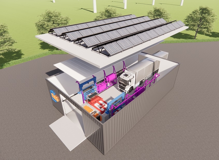Die Abmessungen der AkkuSwap-Stationen variieren je nach Kundenanforderung. Der Grundaufbau und die Komponenten sind jedoch immer gleich:
